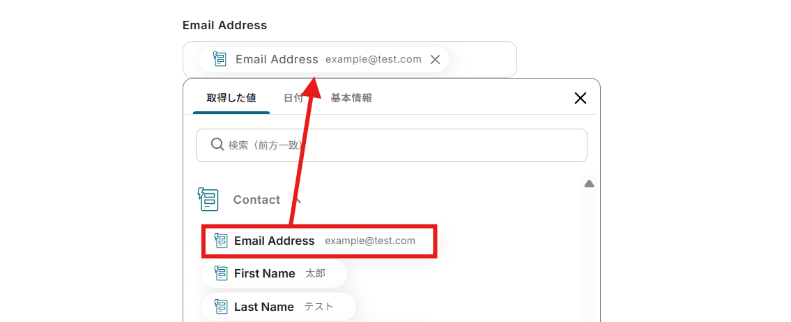 取得した値には、以下の画像のようにテストで使用するメールアドレスなどを設定しておきましょう。