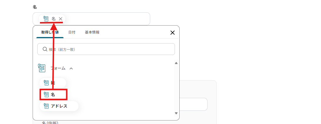 姓と名も同様に、フォームの回答内容を自動でShopifyの顧客情報に登録できるように設定されています。