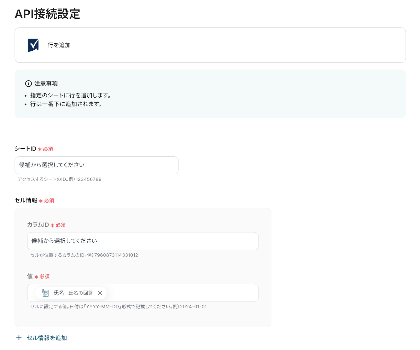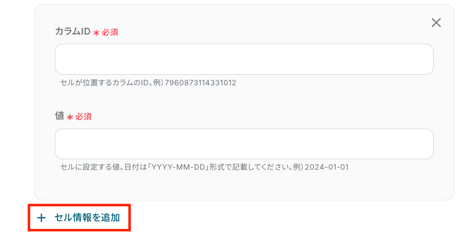 はい、可能です。追加するセルを増やしたい場合、【+ セル情報を追加】をクリックすることで設定項目を増やすことができます。