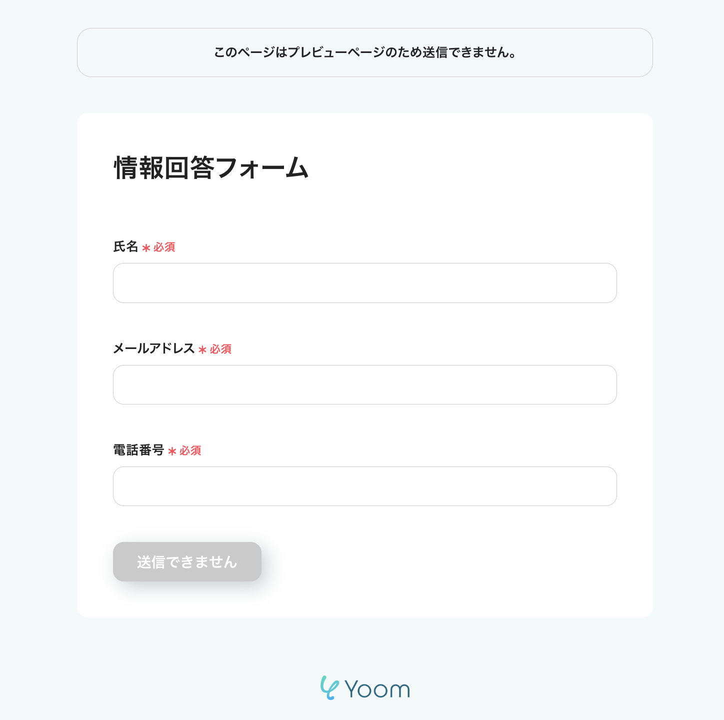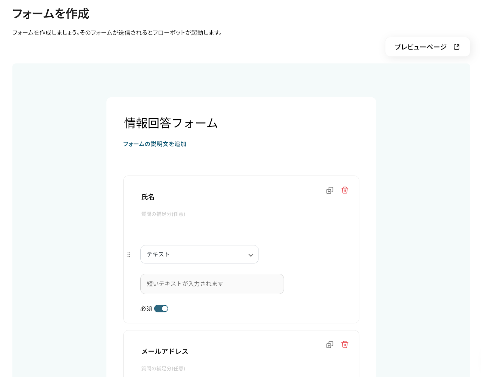 右上の「プレビューページ」をクリックすると、フォームの完成形を確認することができます。 以下は、デフォルトで設定されているフォーム内容のプレビュー画面です。