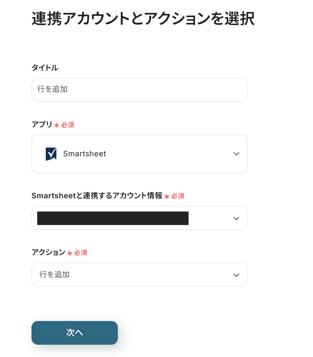 以下のような画面に移ります。ここでは、先ほど設定したフォームの回答内容をSmartsheetへの登録内容として反映させるための設定を行います。