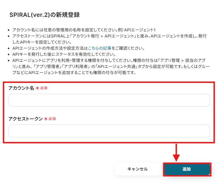 SPIRALを選択できたら、アカウント名と事前に取得したアクセストークンを入力して「追加」をクリックします。