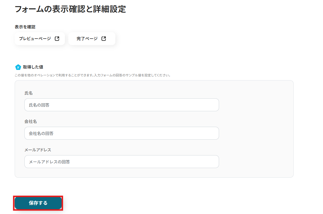今回は、氏名・会社名・メールアドレスを回答してもらうフォームを作成しています。
