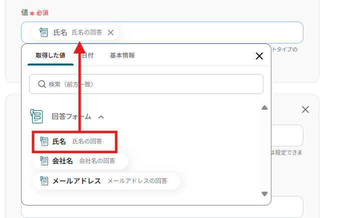 3)必須項目を入力します。値には先ほど取得した回答フォームの情報をアウトプットとして挿入することができます。