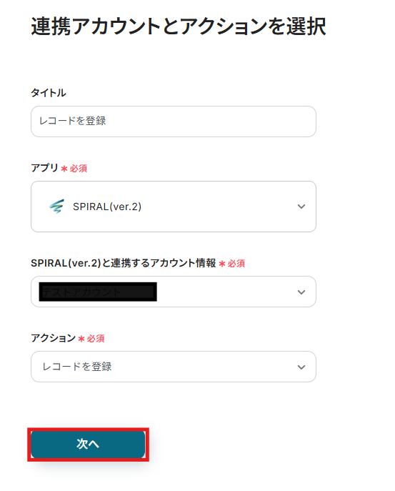 ステップ4:SPIRALへレコードを登録するアクションを設定