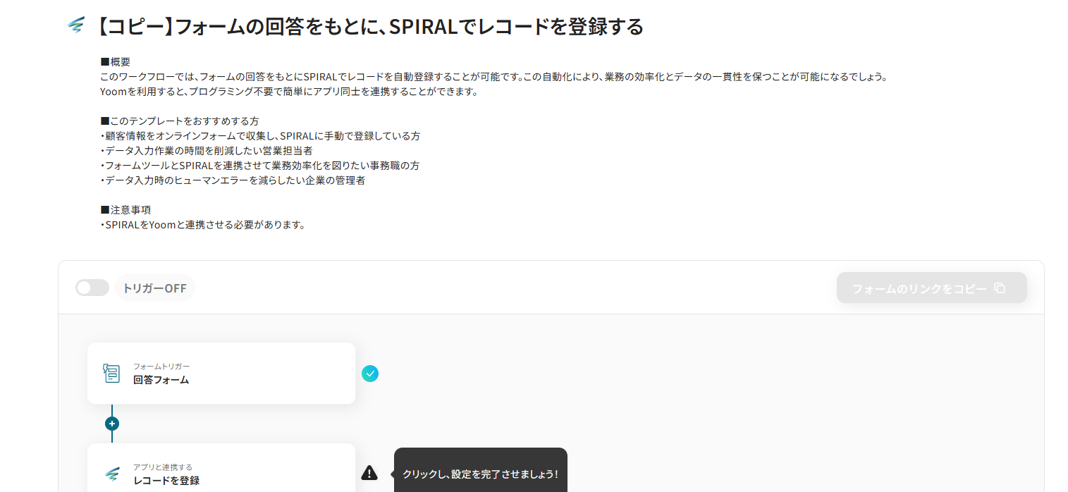 このワークフローでは、フォームの回答をもとにSPIRALでレコードを自動登録することが可能です。この自動化により、業務の効率化とデータの一貫性を保つことが可能になるでしょう。