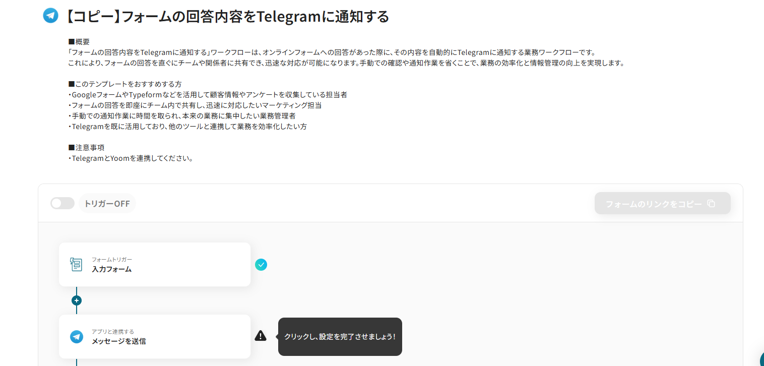 YoomにはTelegramとフォームを使った業務フローを自動化するためのテンプレートが用意されています!今すぐ試したい方は以下よりバナーをクリックしてスタートしましょう!