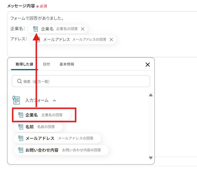 3)メッセージ内容には先ほど取得した回答フォームの情報をアウトプットとして挿入することができます。