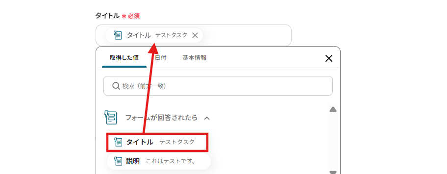 取得した値には、以下の画像のようにテストで使用するタイトルなどを設定しておきましょう。