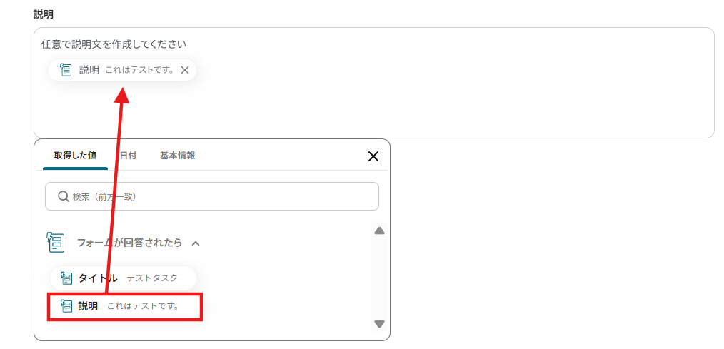 タイトル:入力欄をクリックすると以下のように先ほどテスト用に設定した情報を引用できるので、活用してくださいね。