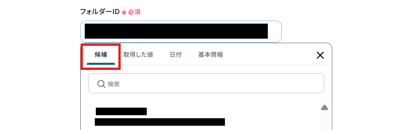 フォルダーID:入力欄をクリックすると以下の画像のように候補が表示されます。