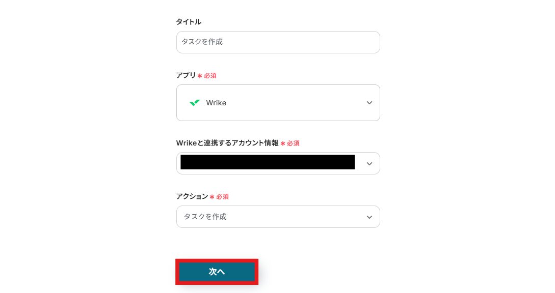 タイトルと連携するアカウント情報を任意で設定し、アクションはテンプレート通りのまま「次へ」をクリックして進んでください。