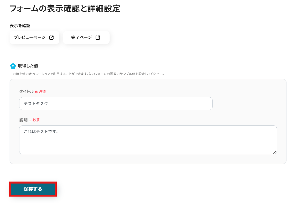 ※ここで入力したテスト値は、フローの実行時に影響しません。