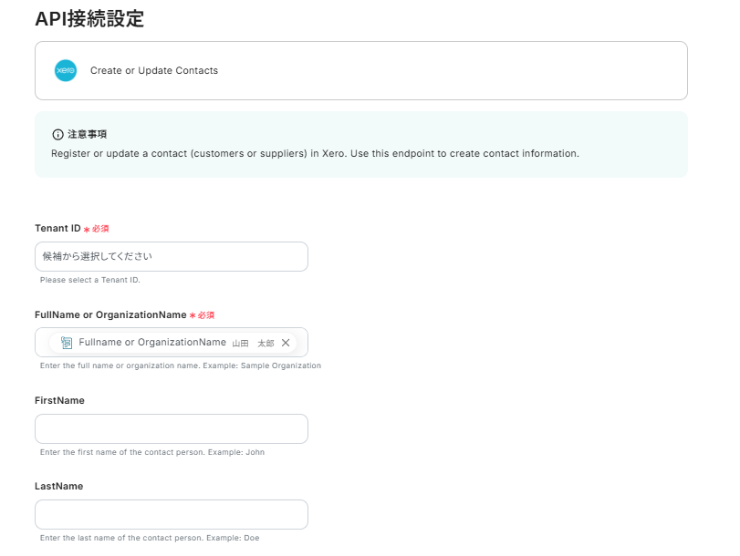 Xeroの「Create or Update Contacts」アクションを設定する際、複数のXeroテナントを管理している場合は、対象となるテナントのIDを任意で設定することが可能です。 ■注意事項
