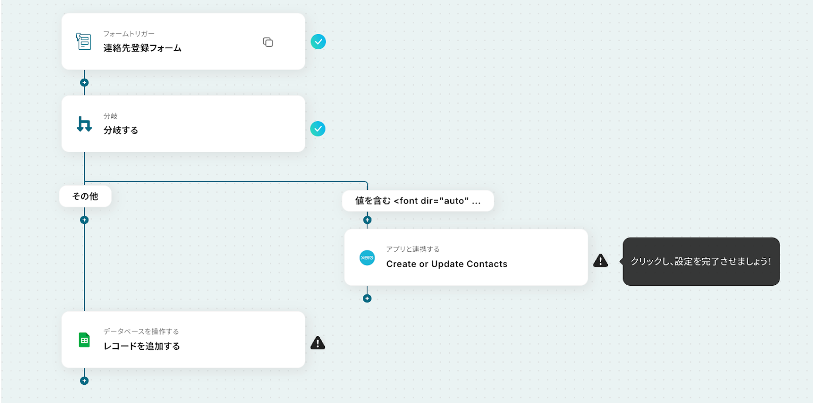 分岐アクションを追加することで、特定の条件を含む場合のみフローボットを進める、といったフローを実現できます。 今回は連絡先の追加のみのアクションを設定していますが、分岐先を分けて一方に「連絡先の作成または更新」、もう一方の分岐先にデータベースツールの「レコードを追加」を設定することで、条件に合致していない連絡先の情報も効率よく収集できるようになるでしょう。