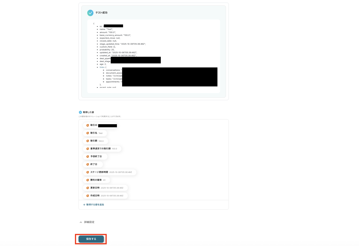 フローボットの起動条件となるイベント(新規取引の作成)を実行し、「テスト」をクリックします。 テストが成功すると、以下のように表示されて登録した内容が取得できました! テスト完了を確認して『保存する』を押しましょう。