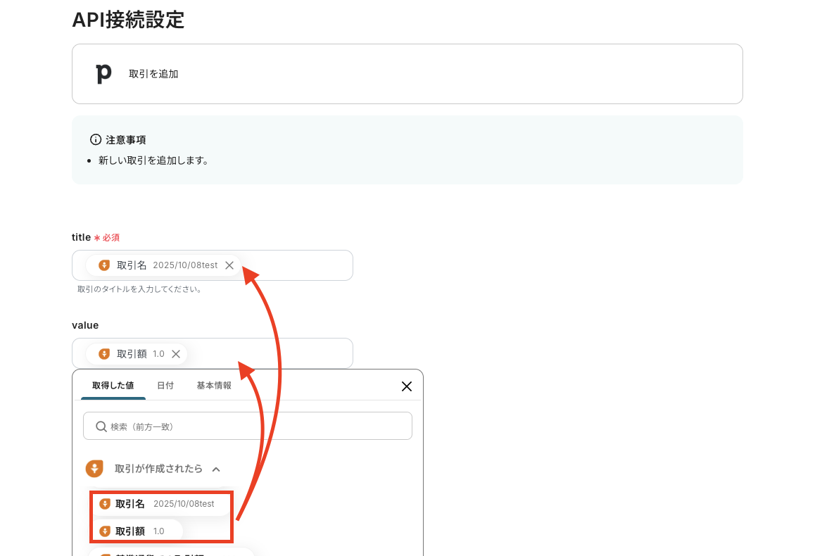 A:Freshsalesで登録した項目(例:取引名など)を、変数としてPipedriveの該当する項目に自由に引用できます。 適切な項目に情報が自動登録されるので、設定画面で運用に沿った内容を連携可能です!