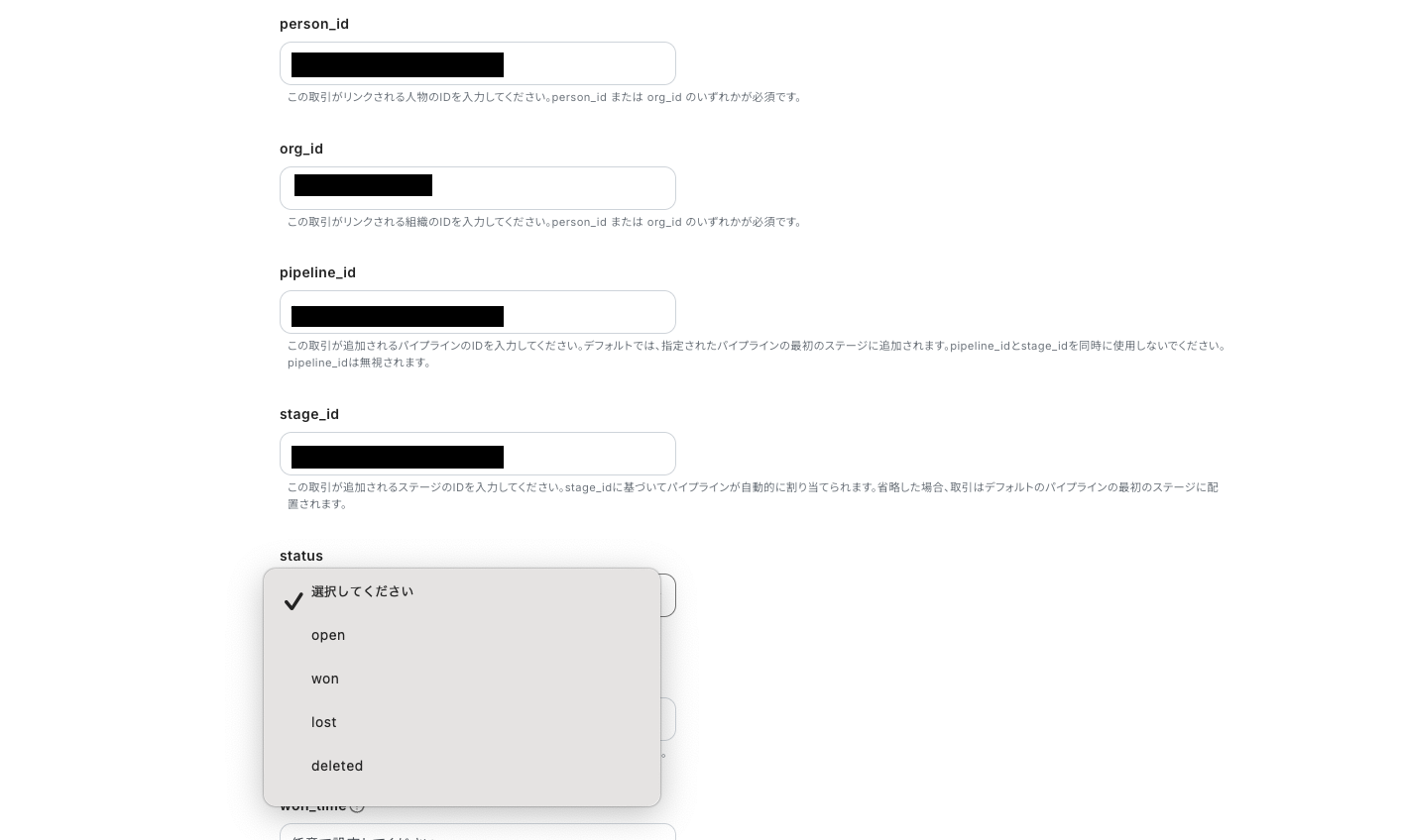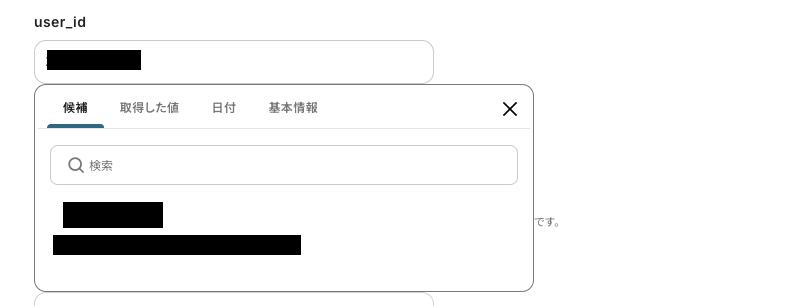 「user_id」や「pipeline_id」は、入力バーをクリックすると、連携したアカウントに基づいた情報が表示されるので、こちらから該当するものを選択しましょう。