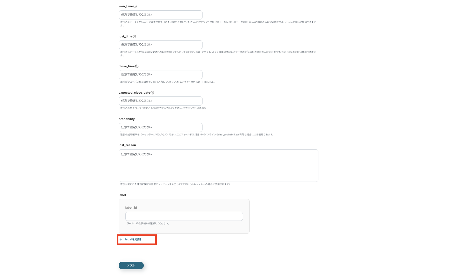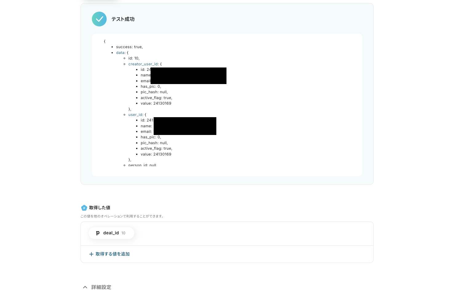 情報を設定し終わったら「テスト」を押しましょう。 テストに成功すると、以下のように表示されて、実際にPipedriveで取引情報が追加されます。