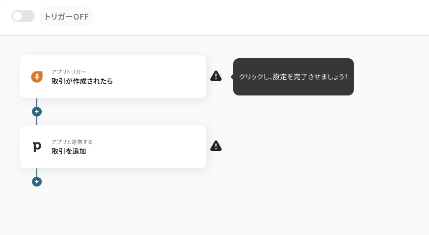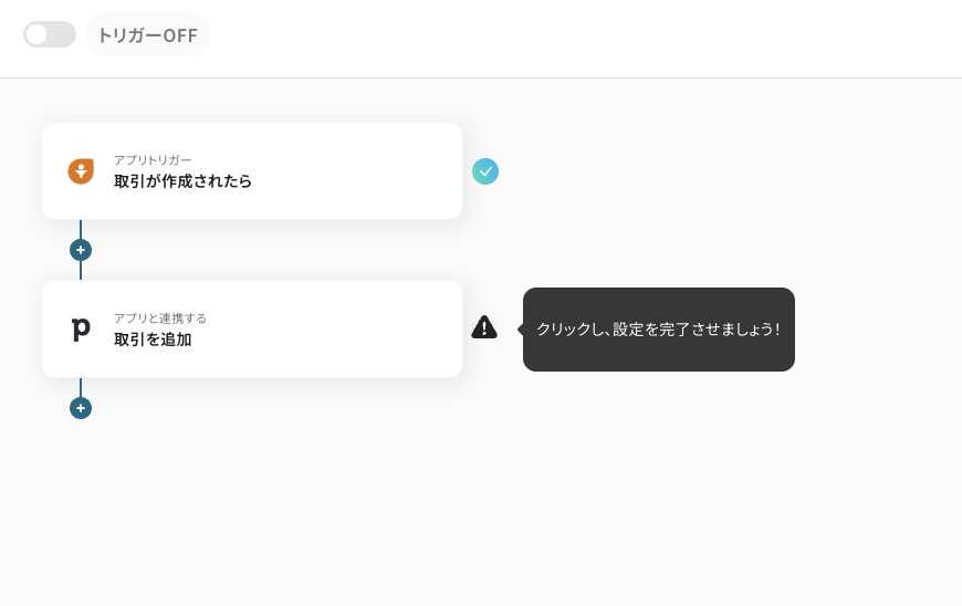 以下画面のようにテンプレート内容が表示されます。 トリガー(フローボットの起点となるアクション)の「取引が作成されたら」をクリックしてください。
