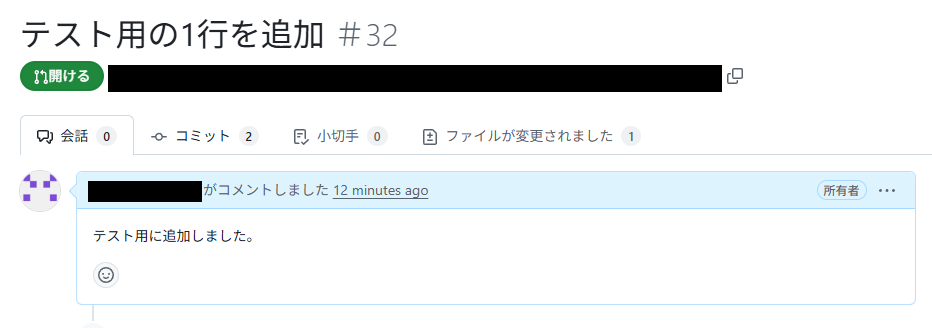 メッセージ内容を入力後「テスト」をクリックし、プルリクエストにコメントとして追加されていれば設定は完了です。
