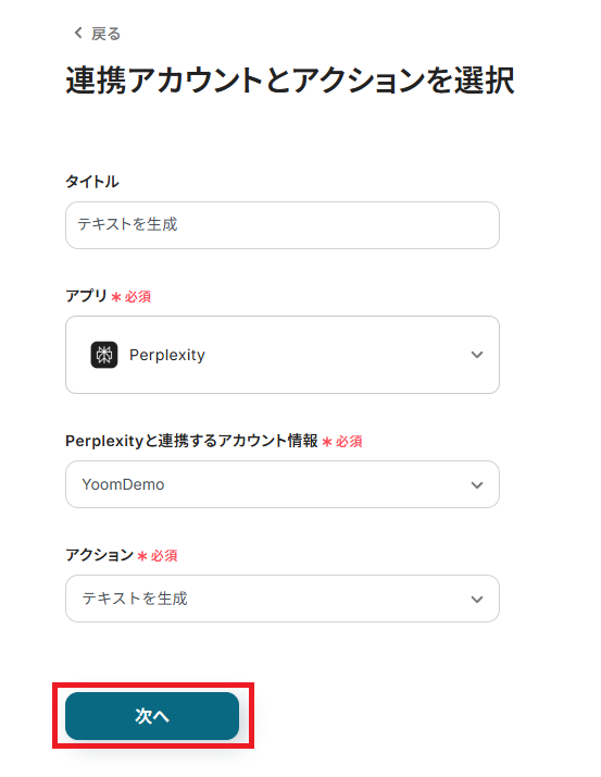 Perplexityと連携するアカウントに間違いがないかを確認し、「次へ」をクリックしましょう。