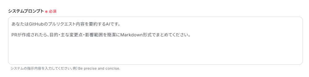 「システムプロンプト」はシステムに指示したい内容を入力してください。今回は以下のように設定しました。
