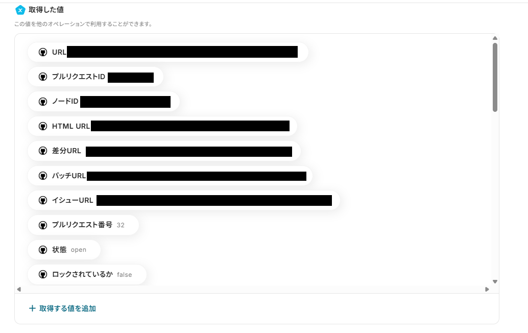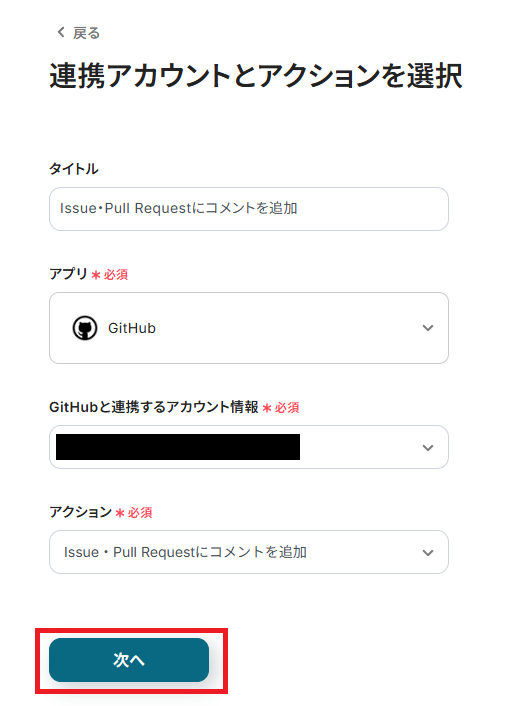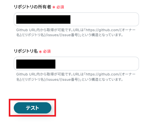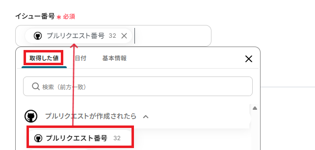 「イシュー番号」は取得した値から、テストで作成したプルリクエストを選択してください。