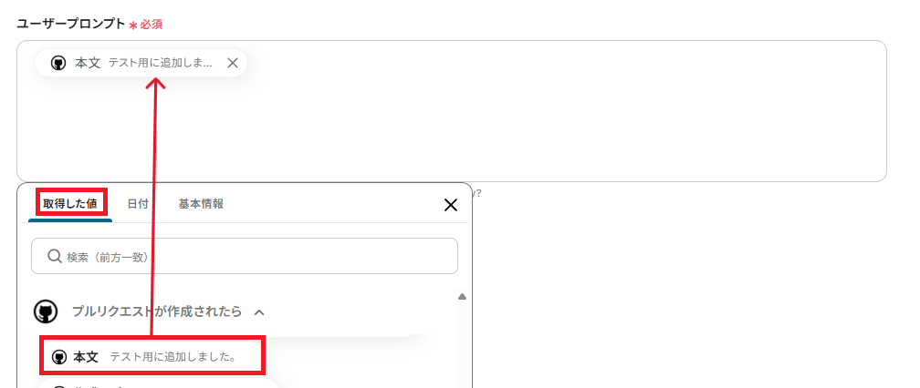 「ユーザープロンプト」は下記のように取得した値を利用して設定ができます。