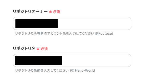 「リポジトリの所有者」と「リポジトリ名」を注釈に沿って入力しましょう。