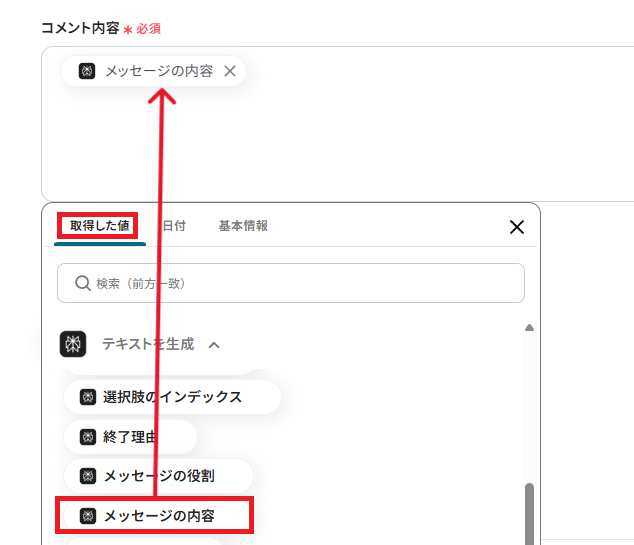 「コメント内容」は、先ほど取得したPerplexityの値を選択しましょう。