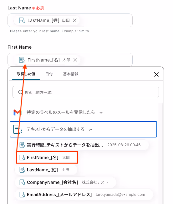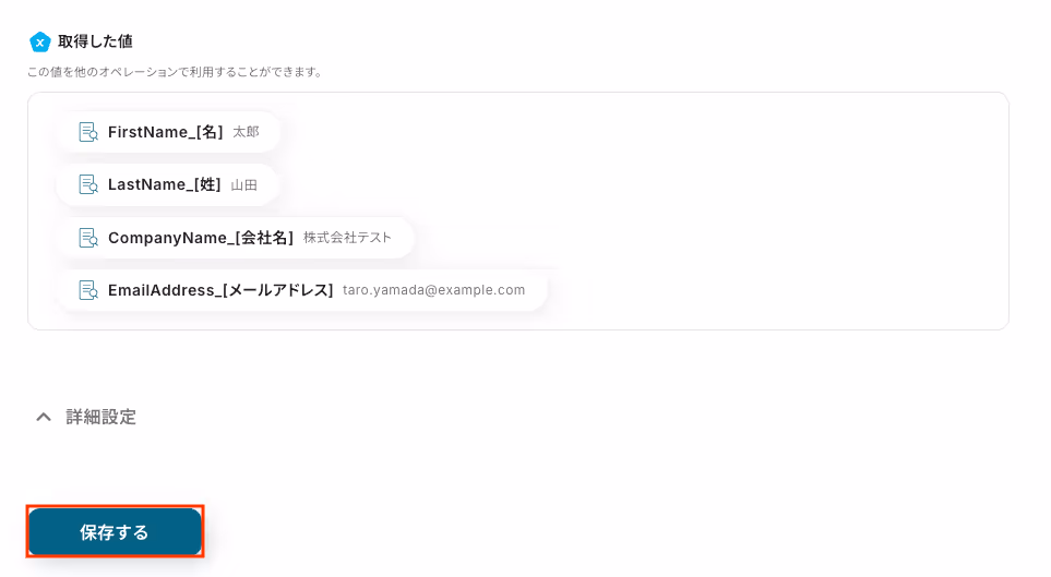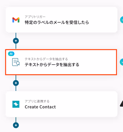 以下の画像の取得した値(=アウトプット)を利用し、この後のステップでAIを用いてメール内容からContactの作成に必要なデータを抽出できます。