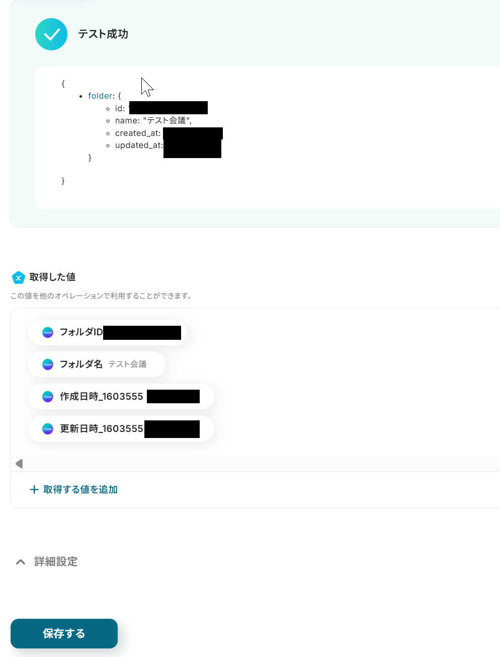 親フォルダIDも入力し、「テスト」をクリックします。