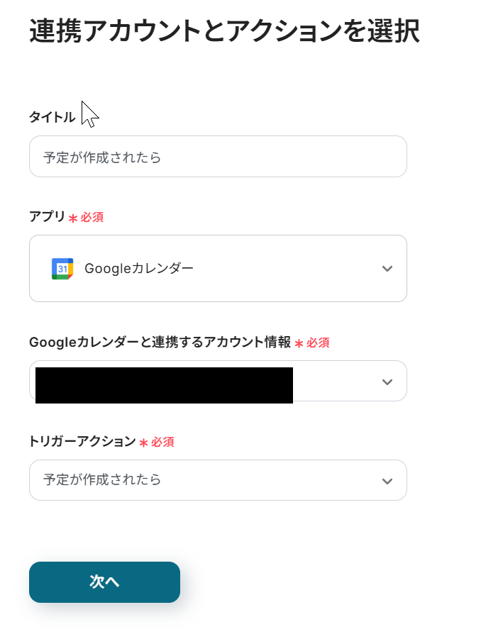 トリガーアクション:Googleカレンダーに予定が作成されたら、のまま。