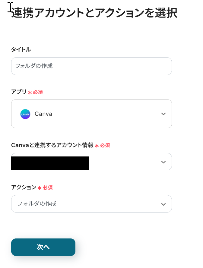 次に2つ目の工程をクリックします。 前項で取得した値から、Canvaにフォルダを作成する設定を行います。