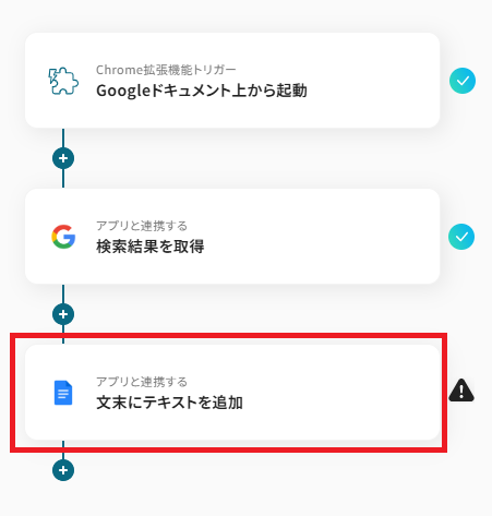 はじめに、GoogleドキュメントとGoogle 検索をYoomと連携します。 次に、トリガーでChrome拡張機能トリガーを選択し、「Googleドキュメント上から起動」を設定します。 次に、オペレーションでAI機能を設定し、ドキュメントから任意のテキストを抽出します。 続いて、オペレーションでGoogle 検索の「検索結果を取得」を設定し、抽出したテキストを検索キーワードとして指定します。 最後に、Googleドキュメントの「文末にテキストを追加」を設定し、取得した検索結果をドキュメントに追記します。 ■このワークフローのカスタムポイント