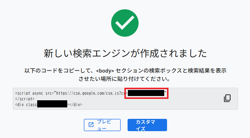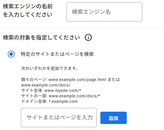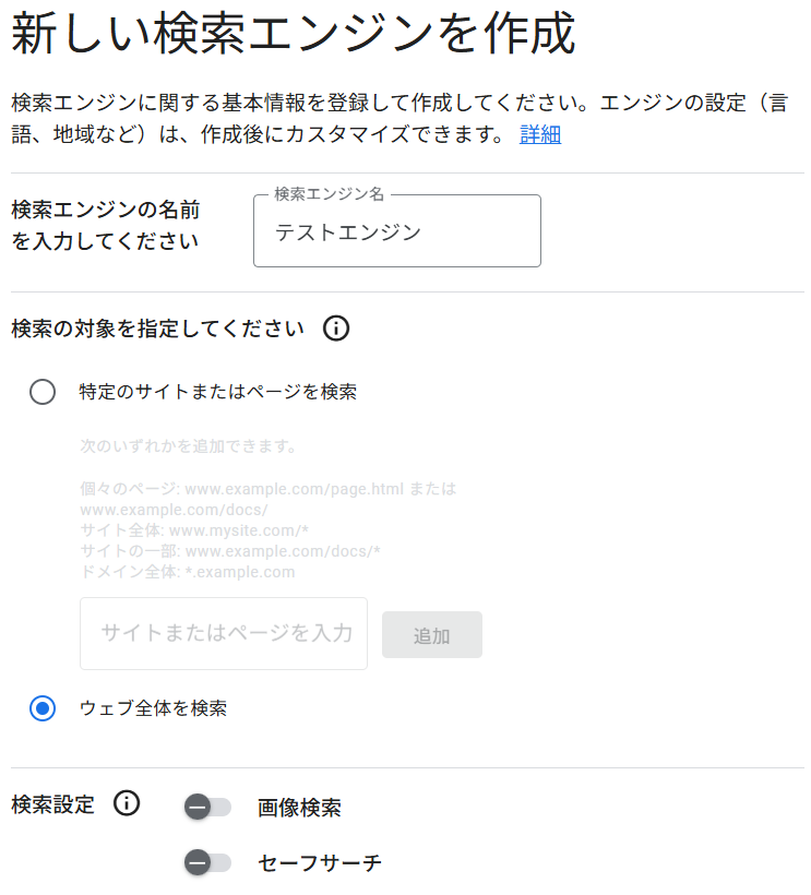 検索エンジンIDを追加する部分があります。この部分はこちらのページ で作成した検索エンジンの検索エンジンIDを設定する必要があります。 上記のページに飛ぶと新規検索エンジンを追加できますので、以下のように追加してみてください。