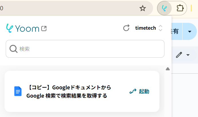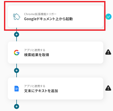 はじめに、GoogleドキュメントとGoogle 検索をYoomと連携します。 次に、トリガーでChrome拡張機能トリガーを選択し、「Googleドキュメント上から起動」を設定します。 次に、オペレーションでGoogle 検索の「検索結果を取得」アクションを設定します。 最後に、オペレーションでGoogleドキュメントの「文末にテキストを追加」を設定し、取得した検索結果をドキュメントに追記するように設定します。 ※「トリガー」:フロー起動のきっかけとなるアクション、「オペレーション」:トリガー起動後、フロー内で処理を行うアクション