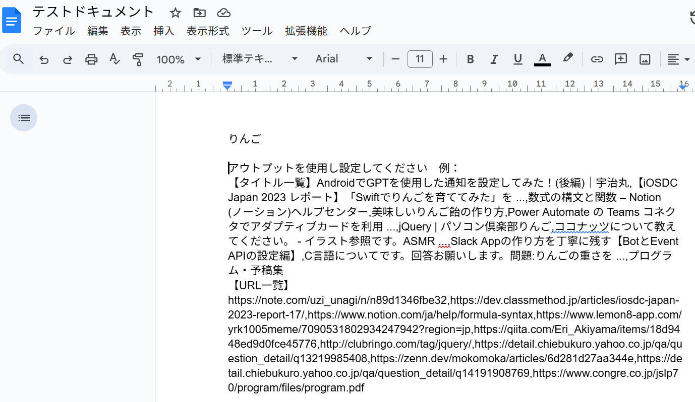 テストが成功し、Google ドキュメントに検索結果が表示されれば完了です。