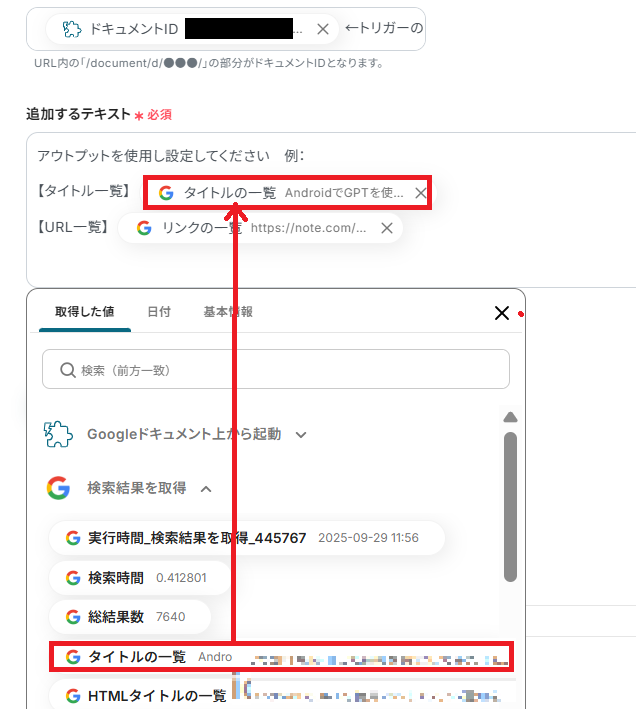Googleドキュメントにテキストを追加するオペレーションでは、出力内容を任意にカスタマイズできます。前段のオペレーションで取得した検索結果を変数として埋め込むだけでなく、任意のテキストを固定値として追加することも可能です。 ■注意事項