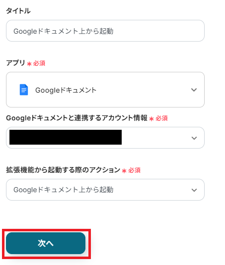 まずはこのフローボットでトリガーになっている、Google ドキュメントの「Googleドキュメント上から起動」というアクションを設定していきましょう。