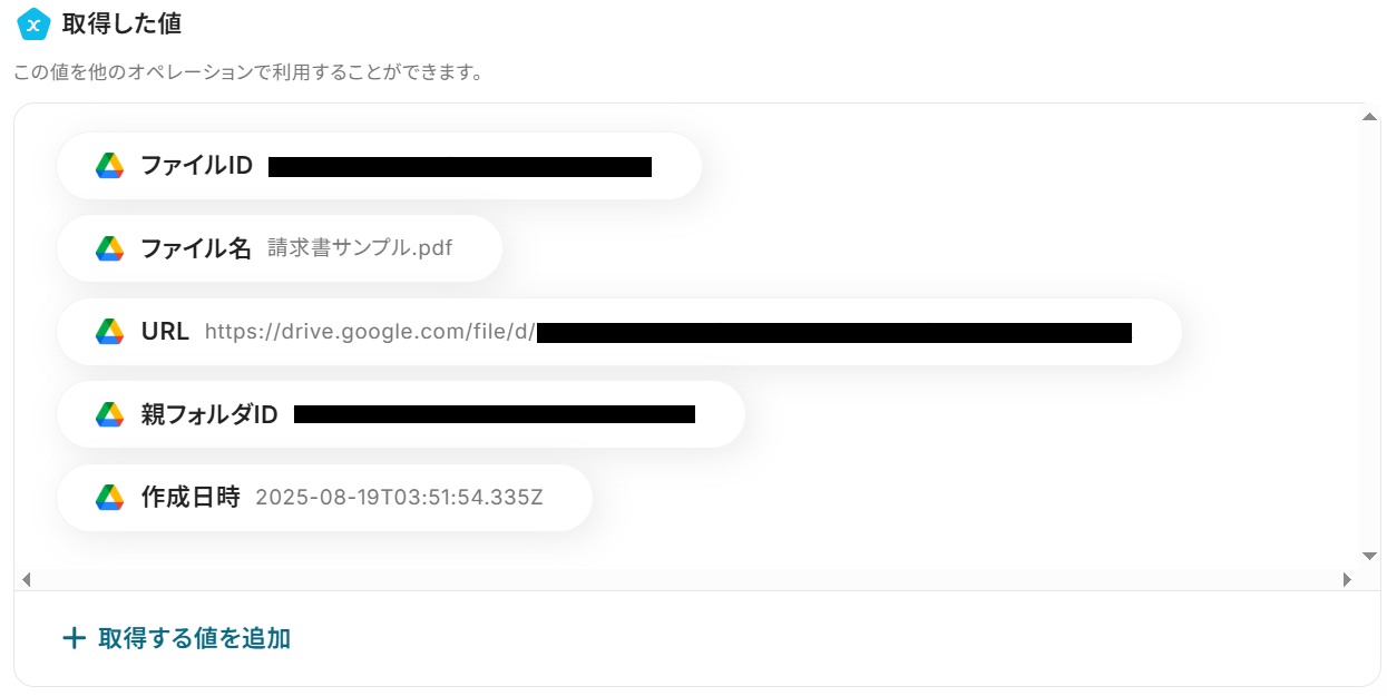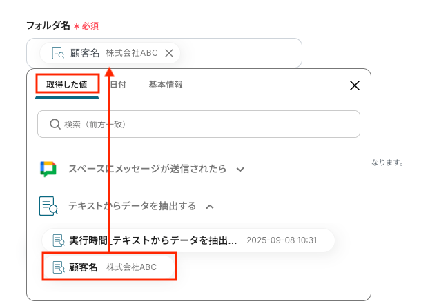 「抽出したい項目」には、 Google Driveでのフォルダ作成を想定し、フォルダ名にしたいものを手動で入力します。