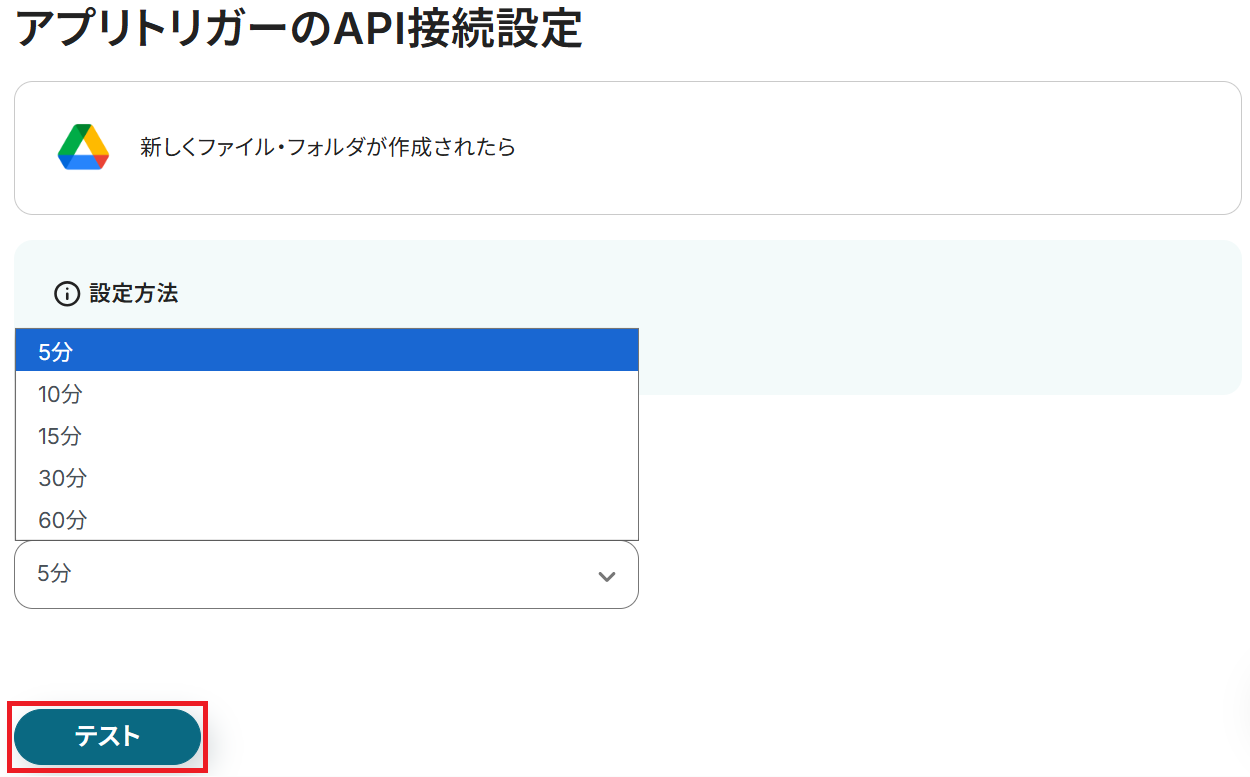 アプリトリガーのAPI接続設定という画面が表示されるので、トリガーの起動間隔をプルダウンから選択してテストしてください。