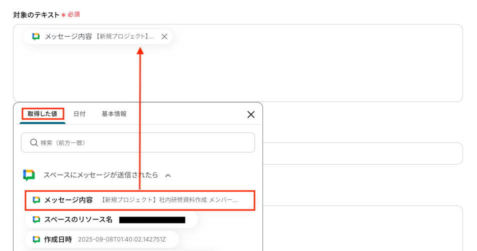 「対象のテキスト」を取得した値から選択してください。 取得した値を使用することで、毎回最新のメッセージからテキストを抽出できます。
