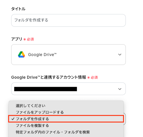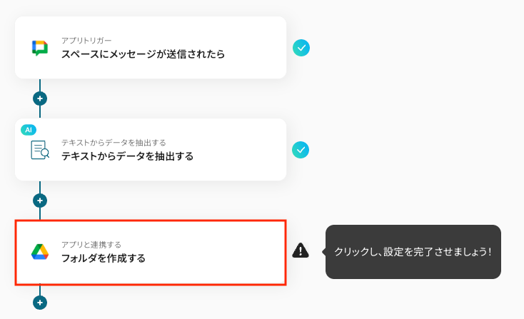 Google Chatから抽出したテキストを使って、Google Driveにフォルダを作成するための設定をします。 最後のオペレーションにある、「フォルダを作成する」をクリックしてください。