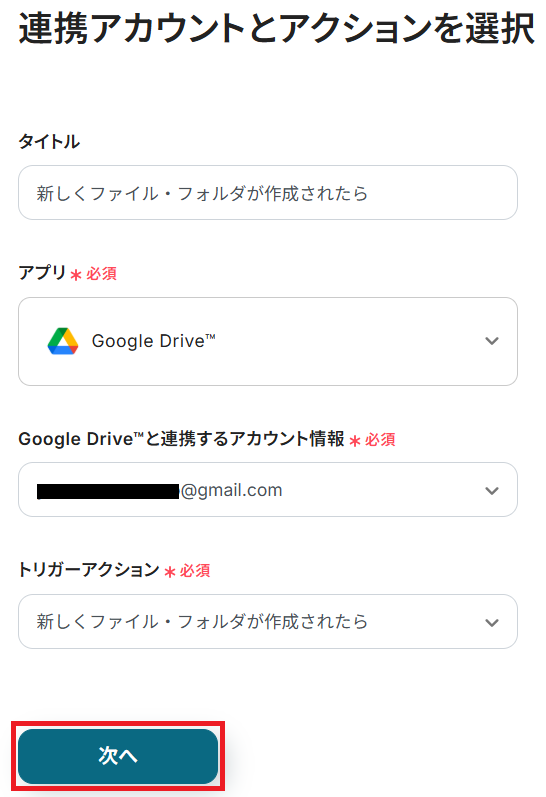 タイトルと連携するアカウント情報を任意で設定し、トリガーアクションはテンプレート通りに「新しくファイル・フォルダが作成されたら」のまま「次へ」をクリックします。