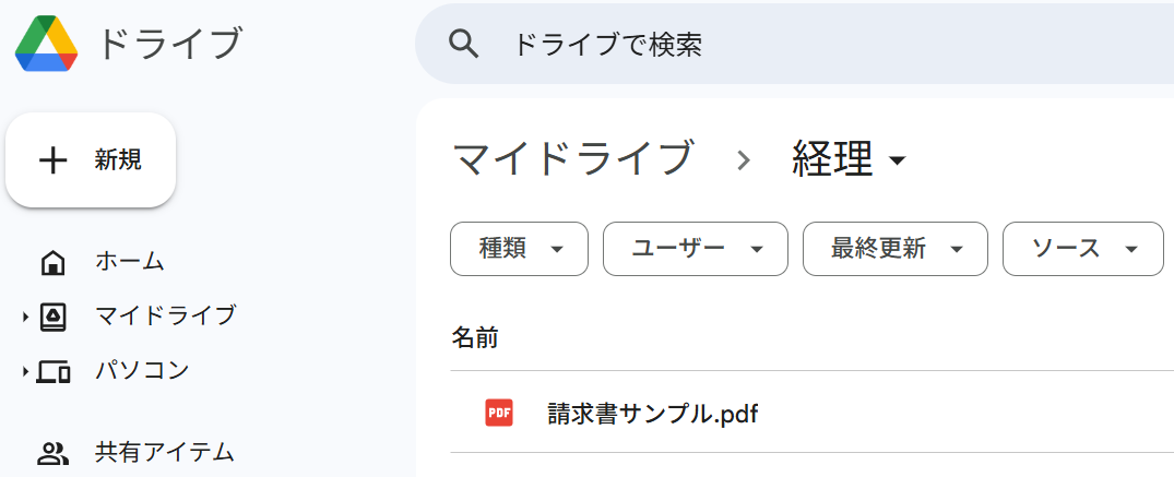準備として、Google Driveのフォルダにテスト用ファイルをアップロードしておきましょう。今回は例として「経理」フォルダを作成し、請求書のPDFファイルを格納しました。