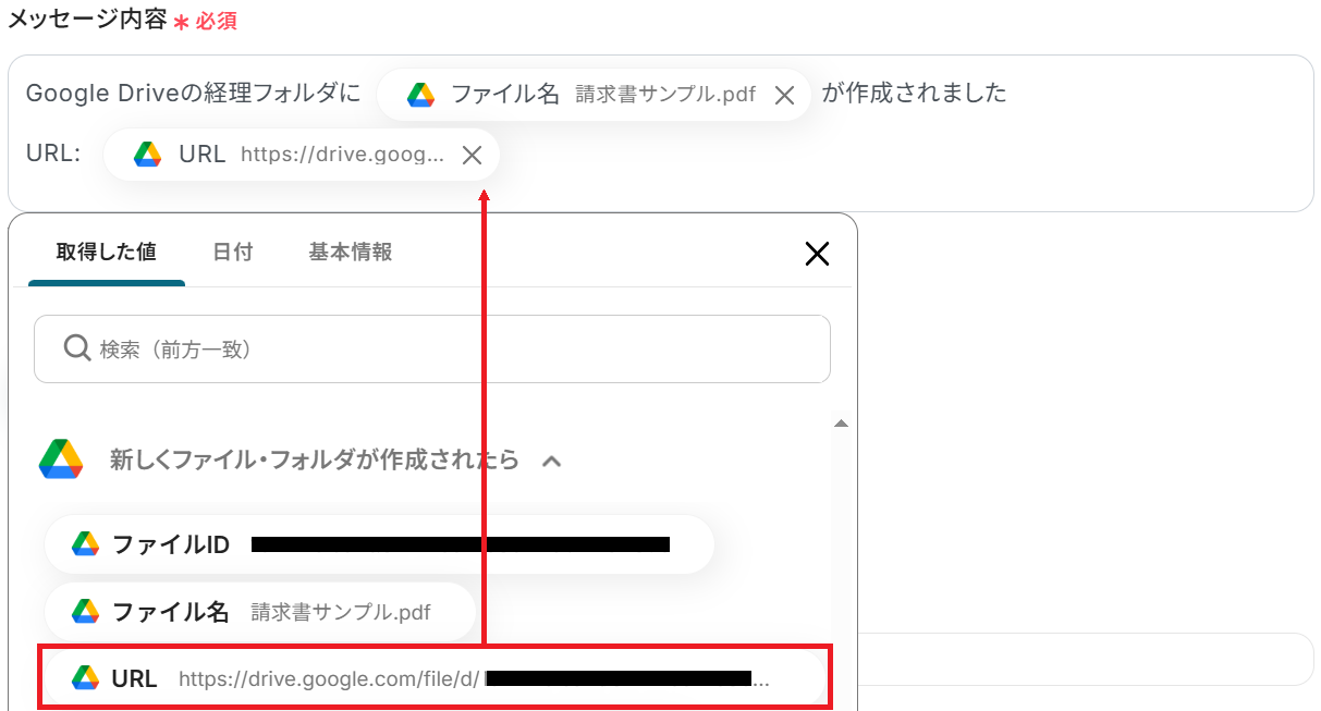 次にメッセージ内容を入力しましょう。 固定の文章や、Google Driveから取得した値などの変数を組み合わせて自由にカスタマイズすることが可能です。 取得した値を利用することで、トリガーが起動するたびに最新の値を自動で引用できます。