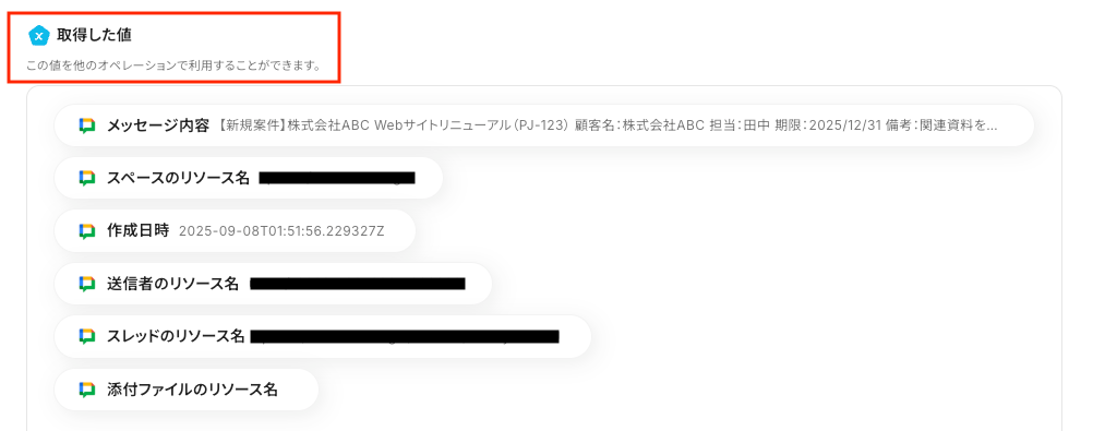 テストが成功すると取得した値が表示され、先ほど送信したGoogle Chatのデータが確認できます。 「保存する」をクリックして完了です!