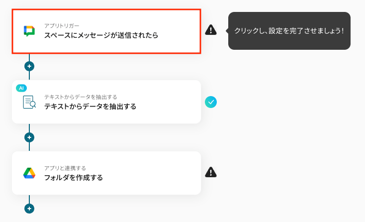 Google Driveのトリガー設定では、処理を自動化したいファイルが格納されるフォルダを任意で指定してください。 AI機能のOCR設定では、読み取り対象のファイル形式や抽出したい項目、読み取り言語などを業務内容に合わせて設定してください。 Google Chatへの通知設定では、メッセージを送るスペースのリソース名や、送信するメッセージ内容を自由にカスタマイズしてください。 ■注意事項